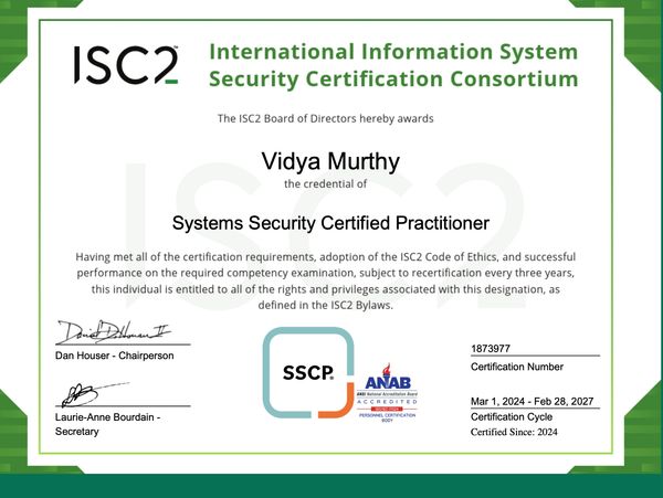 "Vidya is a highly capable cybersecurity professional who displays a true passion for the domain. She demonstrates excellent critical thinking in all aspects of accomplishing an objective. Vidya is also one of the most inclusive and thoughtful students I’ve ever encountered at Carnegie Mellon University. She strives to collaborate with respect for all. I first met Vidya when she was a student in my cybersecurity policy and governance course at the Heinz College of Information Systems and Public Policy. I also had the pleasure of serving as her thesis advisor. Vidya consistently exceeded expectations in her research and application of analytical techniques. Based on these experiences, I can endorse Vidya without hesitation. She is a remarkable person with a very bright future ahead in our profession."
